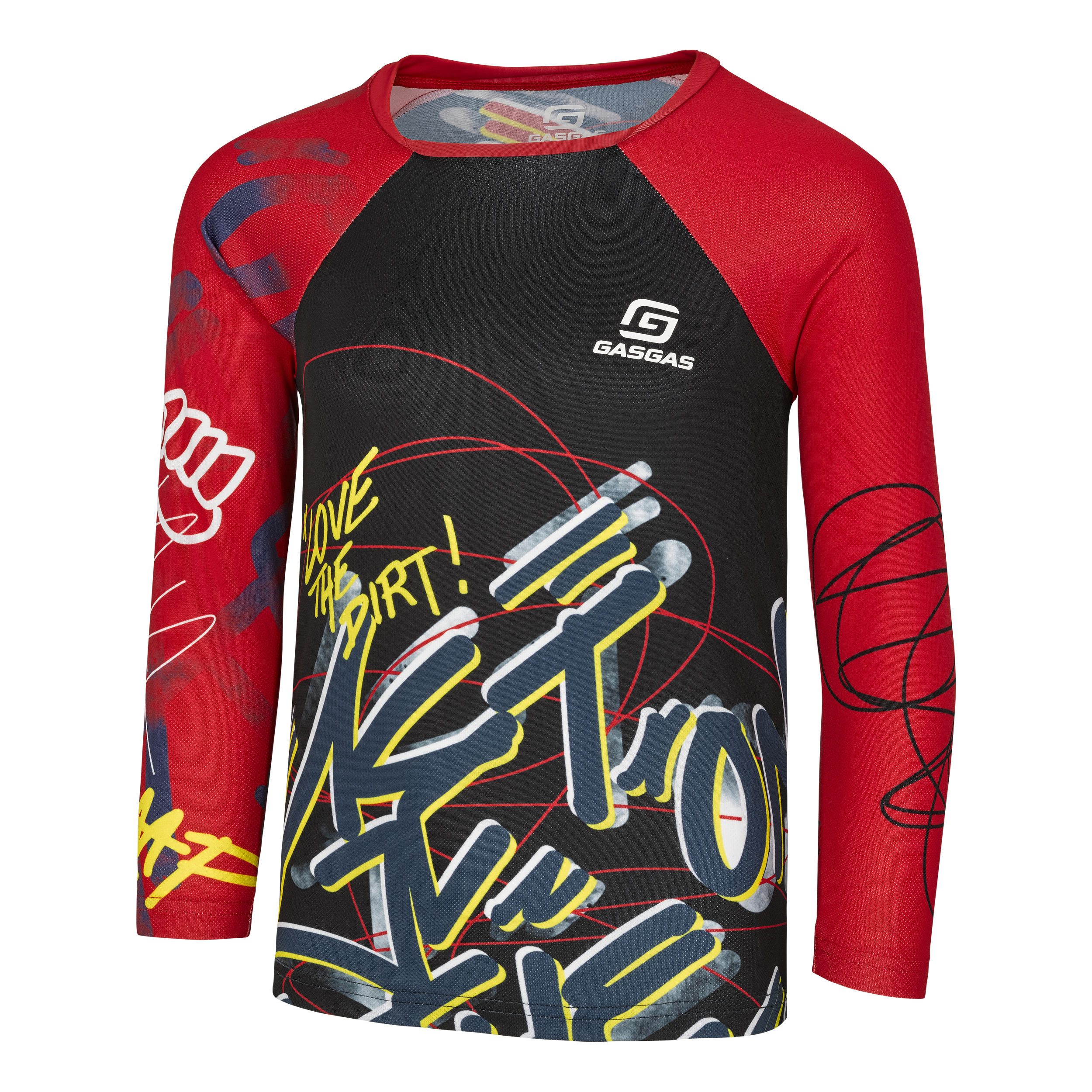 Oddychający i szybkoschnący materiał zapewnia komfort termiczny, a elastyczność tkaniny pozwala na pełną swobodę ruchów. Koszulka jest dostępna w atrakcyjnej kolorystyce czarno-czerwonej, która podkreśla sportowy charakter i pasuje do każdego offroadowego stroju młodego motocyklisty.
