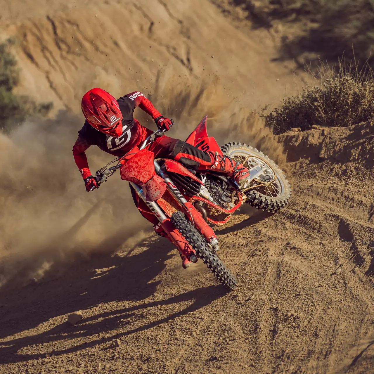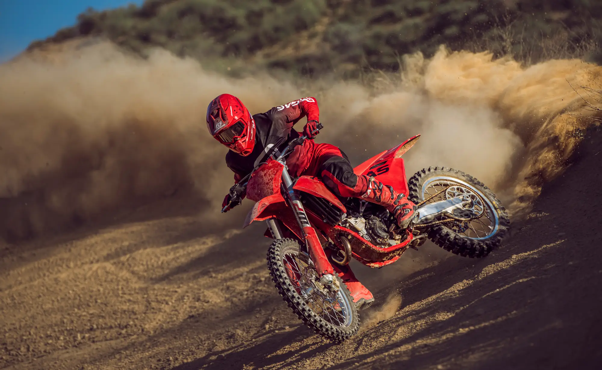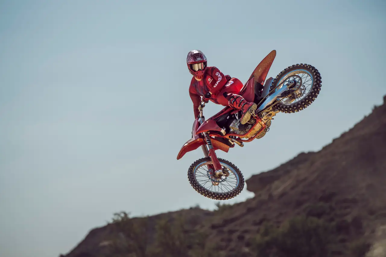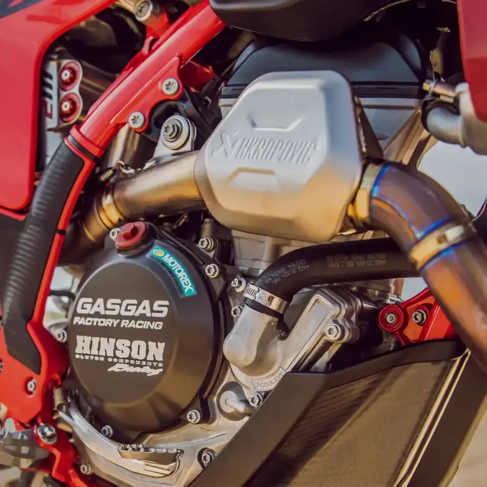 Na sezon 2025 MC 450F zyskał kilka istotnych aktualizacji. Zmieniona rama poprawia stabilność, zwłaszcza w momentach wchodzenia w zakręty, a nowe ustawienia zawieszenia pomagają utrzymać pewność prowadzenia na każdym fragmencie toru. Przeprojektowany dolot powietrza, większe podnóżki i wzmocniony pedał hamulca tylnego to detale, które razem tworzą jeszcze lepszą całość. Klasyczne, czerwone nadwozie pozostaje niezmienne – to znak rozpoznawczy GASGAS i gwarancja stylu, który nie potrzebuje zbędnych słów.